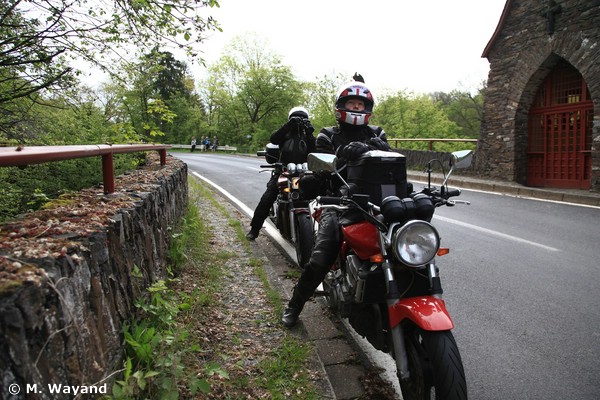Doch zunächst galt es, örtliche Sperrungen in der Eifel gewusst wie zu umfahren - das gelang so geschickt, dass wir uns plötzlich vor der Burg Pyrmont wiederfanden, ein willkommenes Fotomotiv. O-Ton Michael: "Andere Leute fahren dafür an den Tarn". Also Blinker rechts gesetzt, Michael kramte seine Kamera aus dem Tankrucksack und schoss ein paar Fotos. Ähnliches Spiel von Rainer hinter mir, nur dass er seine deutlich kleinere Kamera in Ermangelung eines Tankrucksacks flink aus der Brusttasche zog. Ich war noch nicht in Knipslaune, sah dem Treiben bzw. Fotografieren ganz entspannt zu ... bis Michael seinen Tankrucksack wieder schloss, den Blinker links setzte und flugs losfuhr. "Huch! Wie? Wo? Was? Geht schon weiter???" Ich war gedanklich noch nicht ganz in Fahrt und leicht irritiert. Sollten die beiden unterwegs etwa immer so fotografieren? Na, das könnte ja noch heiter werden, wo ich mir doch gerne Zeit für ein Motiv nehme!