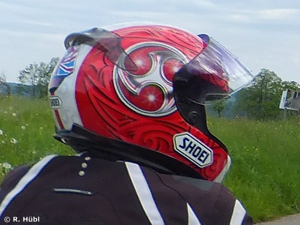 In Kirchberg im Hunsrück folgte ein Tankstopp, der zugleich den Beginn eines Spiels zwischen Rainer und mir bedeutete, welches sich durch den gesamten Urlaub hindurch ziehen sollte: "Wie viel Liter hast Du getankt?" Der Verbrauch der Bandit und der Hornet lagen in etwa gleich und so war es wie ein kleiner Wettbewerb - oder Kleinkinderwettbewerb - "Ätsch, ich hab aber weniger (tanken müssen)." Meistens war dies bei Rainer der Fall ... Den Tankstopp nutzte ich auch, um mich in meine Regenklamotten zu plünnen und Tankrucksack und Hecktasche regensicher einzupacken. Über dem Hunsrück hingen verdächtig tief graue und sehr nass aussehende Wolken. Mit meiner Lederhose bzw. der darüber gezogenen Regenhose wollte ich auf Nummer sicher gehen. Und außerdem ... vielleicht hatte es ja die Wirkung eines Regenschirms!? Wie oft schleppt man den mit sich herum und es regnet doch nicht!?