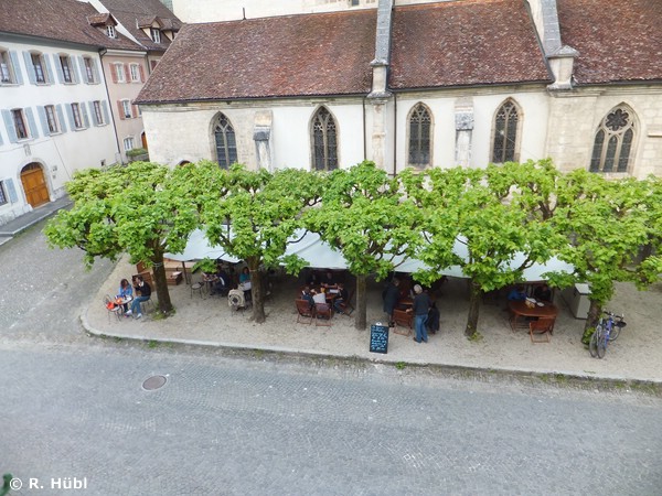 Nur, wenn ein Hotel ausgebucht ist bzw. als einziges Zimmer ein Dreibettzimmer frei ist (und ich hatte mich bei der Nachfrage sehr verständlich ausgedrückt, dass wir drei Einzelzimmer bräuchten!), nützen auch die besten Sprachkenntnisse nix. Also nächstes Hotel angesteuert - netterweise im malerischen (und) kleinen Zentrum von Saint-Ursanne alles per pedes machbar. Im "Hotel de Cygogne", direkt gegenüber der alten Kirche mit angrenzendem ehemaligen Kloster war die gewünschte Zimmeranzahl dann verfügbar, inklusive einem ersten Eindruck vom schweizerischen Preis-Leistungsverhältnis. Das Zimmer - zumindest meins - mansardenähnlich unter dem Dach gelegen, eine kleine Baumarkt-Einfach-Duschkabine in der Ecke (jaja, im Zimmer, nix etra Wand), ein Mini-Waschbecken daneben, Toilette auf dem Flur. Alles kein Drama, ich bin nicht sonderlich anspruchsvoll, so lange das Zimmer sauber und die Matratze fest ist. Aber für 60 EUR!? Hoffentlich wurde das nicht die Messlatte für die ganze Woche ...