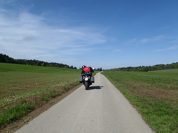 War das sein Ernst? Wollte er mich nur testen, ob ich folgen würde? Wollte er nur schauen, wohin der Weg führen würde? Würde er zurückgefahren kommen? Ein fragender Blick zu Rainer. Ein Schulterzucken als Antwort zurück zu mir. Na gut, blieb mir ja nix anderes übrig. Also hinterher. Und ... ich musste schmunzeln. Der Weg stieß hinter dem Haus wieder auf die geteerte Straße (richtig, die, die rechts am Haus vorbeiführte), wenngleich der Übergang von Weg auf Straße ordentlich matschig war und dem Linksabbiegen auf den befestigten Untergrund einen kleinen Kick verlieh. Aber man höre und staune: Es sollte tatsächlich das einzige Schotterstück in der gesamten Woche bleiben! Wobei Michael betonte, dass dies nun keine bewusste Rücksichtnahme mir gegenüber war (nicht, dass ich diesbezüglich eine Memme wäre, ich fahre fast überall hinterher, so lange ich das Gefühl habe "nichts ist unmöglich").