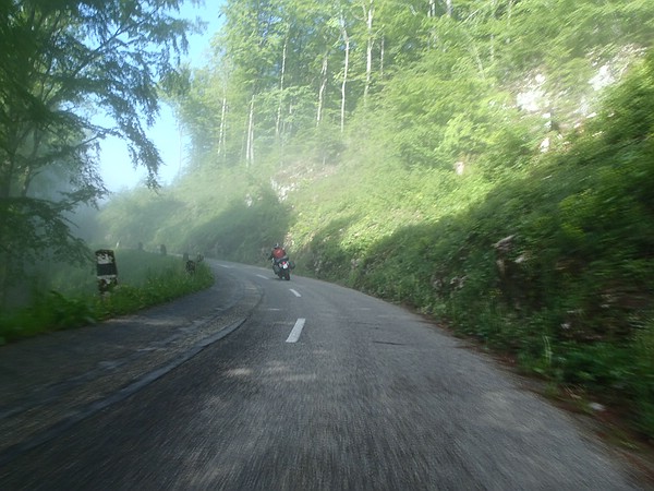 Nun, er hatte die Rechnung wohl ohne Michael gemacht, der sich locker-flockig an ihm festbiss. Auf der Strecke blieb dagegen der Freund des Motorradfahrers. Als wir an einem Abzweig ins Tal vom Zusammenfluss der Flüsse Tacon und Bienne abbogen, in dessen Talkessel Saint-Claude liegt, war jener im Rückspiegel längst nicht mehr zu sehen. Erst als wir auf der Abfahrt wegen einsetzendem Regen hielten, damit ich meine Regenklamotten anziehen konnte, schwirrten die beiden an uns vorbei.