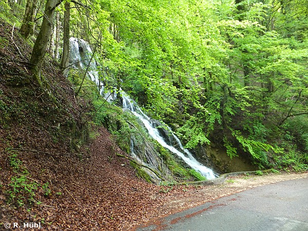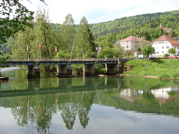 Was für ein glücklicher Zufall, dass Michael seine Helmkamera eingeschaltet hatte! Ein bewegender Anblick. Mir fiel augenblicklich eine Szene im Film "Die wunderbare Welt der Amélie" ein, wo ebenfalls ein Pferd neben einem Radrennen her galoppiert. Die Filmmusik dieser Szene ging mir den ganzen Tag nicht mehr aus dem Kopf. Auf leicht verschmutzten Straßen ging es durch den Wald und an einem kleinen hübschen Wasserfall vorbei wieder hinab ins Tal, wo wir im Grenzort Goumois herauskamen und am Ufer des Doubs den nächsten Fotostopp einlegten. Hier hätte eigentlich unser Übernachtungsziel am Vortag liegen sollen, aber zeitlich wäre es dann sehr spät geworden. Passte schon so wie es war, sonst hätten wir die galoppierenden Pferde nie vor die Linse bekommen. So genossen wir die spätmorgendliche Idylle am Doubsufer, bevor wir uns über Saint-Imier auf zum nächsten Highlight des Tages machten (das weiß ich heute ... da ich keinerlei Routenplanung betrieben hatte, sagten mir die Namen, die Michael vorher einwarf, reichlich wenig).