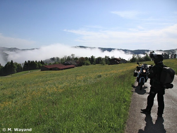Wenig später ein erleichtertes Strahlen im Gesicht der Angestellten - und, ehrlich gesagt, Erleichterung auch bei uns: Baguette und Croissants wurden endlich geliefert und die etwas verschämt angebotene Einzelportion (Notration) von Kellogs Smacks im Kartönchen durfte auf ihren nächsten Verzehr warten. Nach dem Frühstück machten wir uns auf den Weg. Die Strecke sollte weiter durchs Schweizer Jura über Le Chasseral, mit 1.607m die höchste Erhebung der Region, dann in Richtung Genfer See führen. Als Tagesendziel war eine Übernachtung im Savoyen angedacht. Wir überquerten den Doubs noch bei Saint-Ursanne und schwangen uns über die Route Cantonale in die Höhe. Was für ein Bild - der Nebel waberte im Tal und wir standen sozusagen über den Dingen im Sonnenschein. Das war allemal den ersten Fotostopp des Tages wert. Über kleine Straßen ging es weiter bergauf und bergab und bald folgte, oh welche Überraschung, die erste Schotterpassage dieser Tour.