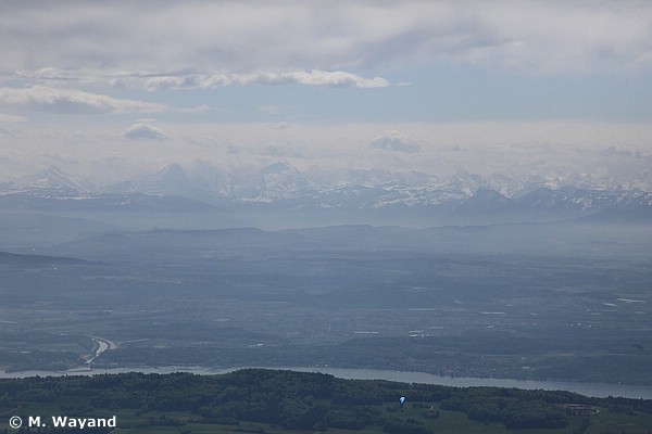 Aber Starrsinn des einen und ungeschicktes Rückwärtsmanöver des anderen führten erst einmal zu einem kleinen Geduldsspiel für alle Parteien, uns inklusive, die wir geduldig hinter dem einen - gottseidank vorwärts fahrenden - Auto ausharrten. Endlich vorbei, ging´s weiter den Berg hinauf, zunächst bis zum Pass Col de Chasseral (1.502m), von wo aus man plötzlich eine grandiose Fernsicht über den Bieler See sowie den Lac de Neuchâtel und die dahinter liegende Alpenkette hatte. Bei klarem Wetter wäre sogar der Mont Blanc sichtbar. Uns blieb dieses Tüpfelchen auf dem i leider verwehrt, aber es war auch so ein beeindruckender Anblick. Ich musste erst einmal anhalten, um dieses Bild zu inhalieren, wirken zu lassen. Wooooow! Ich fühlte mich plötzlich vom Alltag, von allem ganz weit weg. Urlaub. Endlich Urlaub! Endlich unterwegs! Die restlichen Meter bis zum Gipfel legte ich in gemütlichem Tempo zurück, immer wieder den Blick zu den Berggipfeln werfend. Einfach grandios, diese Natur.