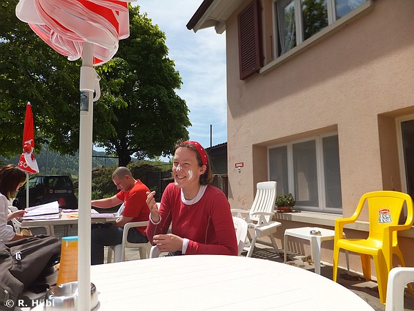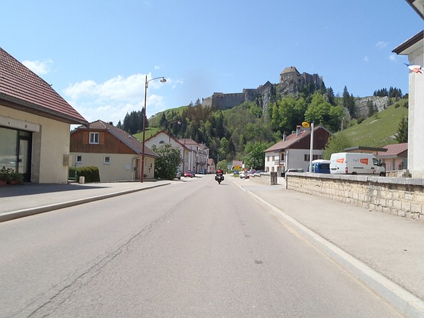 Irgendwann war vorbei mit Trödeln und wir machten uns weiter auf den Weg in Richtung Genf, der uns durch das Val d´Areuse führte. Hinter Brot- Dessous (O-Ton Rainer im Gespräch über Hunger: "Essbare Unterwäsche") legten wir eine kurze Kaffeepause ein. Ich war ein wenig erstaunt, dass die beiden Männer wieder nur Milchkaffee und Wasser bestellten, während sich bei mir schon wieder leichter Hunger breit machte. Ach ja, das mit dem Zehren ... Die Temperaturen wurden richtig sommerlich und wir fragten uns, wo, bitte schön, denn das schlechte Wetter sei, das sämtliche Wettervorhersagen prophezeit hatten??? Immerhin: so hatte ich meine Sonnencrème nicht umsonst eingepackt! Die Route führte weiter durch das Val d´Areuse, dann durch das Val de Travers, durch La-Cluse-et-Mijoux und an seiner beeindruckenden Festung Châteaux de Joux vorbei. Zügig ging es in Richtung Saint-Claude. Zügig, weil ein französischer Motorradspacke glaubte, ein wenig von seinem geschwindigkeitsorientierten Fahrkönnen demonstrieren zu müssen.