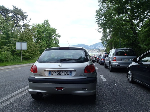 Ein weiterer kurzer Stopp erfolgte in Lajoux, kurz hinter Saint-Claude, auf dem Weg zum Col de la Faucille (1.323m) am "l´incontournable vélo géant". Das riesige Fahrrad aus Holz am Straßenrand der D436 ist nicht zu übersehen und ein Muss für einen Fotostopp. Ich war zudem mutig und entledigte mich wieder meiner Regenklamotten. Hier auf der anderen Seite des Talkessels war der Himmel plötzlich wieder blau, nur mit weißen Wolken bestückt. Wir überquerten endgültig die Jura-Gebirgskette und rollten hinab nach Genf, wo wir es dann richtig mit Hitze zu tun hatten, was auch daran lag, dass wir uns um die Südspitze des Sees herumSTANDEN. Stau ohne Ende, was bei gnadenlosem Sonnenschein und laufendem Motor in Motorradklamotten nicht wirklich ein Genuss war. Michael wollte uns Genf zeigen - bitteschön, wir hatten ausreichend Zeit zur Betrachtung.
