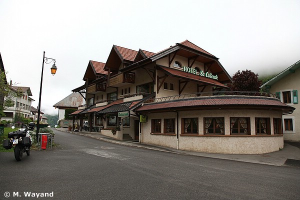 Das Nachfolgen von Hotel-Werbehinweisschildern entwickelte sich zu einer Nervenangelegenheit. Erst schlecht ausgeschildert ... und dann doch geschlossen. Mehr zufällig entdeckte ich auf der Durchfahrt in Bellevaux, einem Bergdorf im Vallée du Brevon, in einer Parallelstraße zur Hauptstraße das Hotel "La Cascade", das nicht wie ausgestorben aussah. Es brannte Licht.