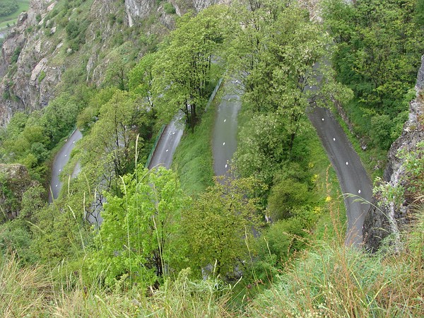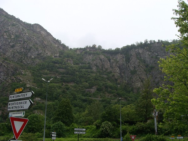 Als erstes Highlight des Tages stand die Serpentinenstrecke Montaimont - Montvernier an. Eine schmale Straße, diese D77b, mit schönen gleichmäßigen Kehren auf beeindruckende Art und Weise an den Berg gezimmert. Die Fotos im Internet fand ich toll, das aktuelle Wetter dazu allerdings weniger. Kurz hinter einem Kreisverkehr zeigte Michael links auf eine Bergwand. Ich sah einen Wasserfall und nickte. Und nickte wiederholt, als er immer noch dahin zeigte. "Jaja, Wasserfall, hab ich doch gesehen". Ein kurzer Stopp und er meinte "Hast Du die Strecke gesehen?" Strecke? Welche Strecke??? Tatsächlich, da war eine Straße im Hang. Aufgrund des Baumwuchses mittlerweile mehr zu erahnen als zu sehen, aber hier und dort ließ sich tatsächlich eine Kehre erkennen. Montvernier, wir kommen!