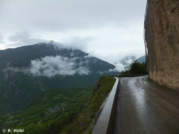 Michael stapfte los - seit wann war er ein großer Wanderer!? - und winkte uns kurz darauf von der Kapelle aus zu. Ah, so weit konnte der Weg dann nicht sein. Also hinterher, und es bot sich eine schöne Gelegenheit, einen Teil der Kehrenstrecke zu fotografieren, dem Regen zum Trotz. Wir fuhren noch ein Stück weiter den Berg in Richtung Col de Chaussy hinauf, durch Montvernier durch - ich fragte mich, wie so oft bei der Durchfahrt durch solche Dörfer, was die Menschen hier so arbeiten und wo von sie leben - bis zu einer Galerie, von wo aus man eine sehr schöne Aussicht ins Tal hatte. Zugegeben, die wäre bei trockenem Wetter sicherlich noch steigerungsfähig und aktuell nicht wirklich einen Stopp wert. Michael gab ein paar Regieanweisungen, und ab ging's unter den Augen der Kameras wieder talwärts. Auch runter lässt sich die Montvernier-Strecke sehr schön fahren, aber wie gesagt ... das Wetter. *seufz*