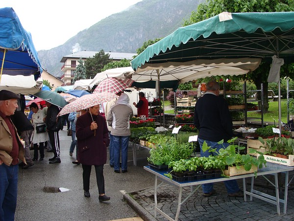Morgens der erste Blick aus dem Fenster ... und ich wollte die Augen am liebsten wieder schließen. Nach wie vor Dauerregen (Himmel, wo kommt das ganze Wasser her?), die Berge wolkenverhangen und ... was war das? Leichter Puderzuckerhauch bis auf die halbe Berghöhe runter. Brrrr, das sah nicht nach optimalem Motorradwetter aus. Ähnliche Vermutungen wurden am Frühstückstisch geäußert, und so wurde die Fahrt über den Col de Chaussy und somit Michaels einziger wirklich geplanter Schotter-abschnitt gleich mal von der Liste gestrichen. Während gegenüber vom Hotel ein Markt aufgebaut wurde, machten wir uns auf die Socken.