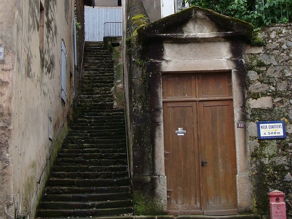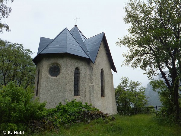 Ziemlich eng (wehe dem Autofahrer, der Gegenverkehr hat), manchmal zwischen den Felsen hindurch, zum Hochwinden schön. Schade, so schade wegen des Wetters. Am Ende des Kehrenstücks stand, etwas oberhalb von der Straße, eine Kapelle - Chapelle de la Balme -, zu der ein Fußweg hinaufführte.