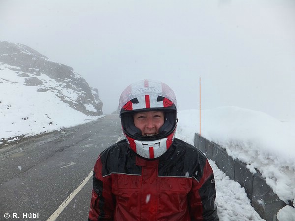 Dem Wetter zum Trotz grinste ich erst einmal eine ganze Weile vor mich hin. Das verging mir aber bald, als wir uns langsam in die Höhe schraubten und ich im Bergdorf St. Jean d´Arviez, noch einige Kilometer vor der Passhöhe, eine Temperaturanzeige sah: +4°C ... das konnte mit jedem Höhenmeter nur schlechter werden! :-O Und in der Tat, langsam mischten sich weiße Flocken zwischen die Regentropfen, und lösten diese bis zur Passhöhe vollständig ab. Col de la Croix de Fer, 2.067m, er wird mir in ewiger Erinnerung bleiben: Schneetreiben und Michaels Ausruf "Das war spitze!" ... es passte für mich nicht so recht zusammen. Ich hatte überhaupt kein Interesse, meine pitschnassen Handschuhe auszuziehen, um mich später mit kalten Fingern wieder in die Dinger zu quälen, und so blieb ich mehr oder weniger regungslos auf der Hornisse sitzen, während Michael filmte und Rainer fotografierte.