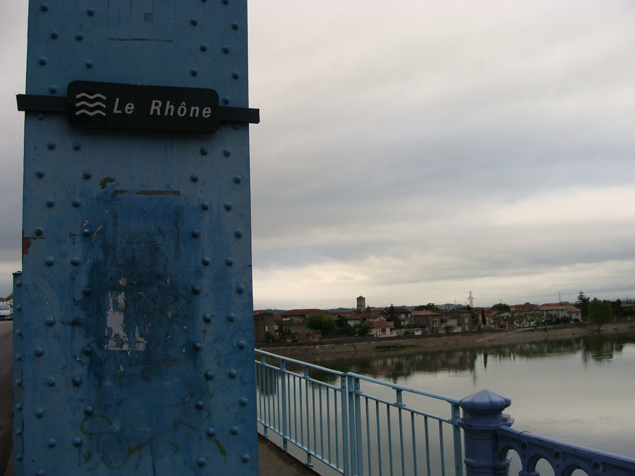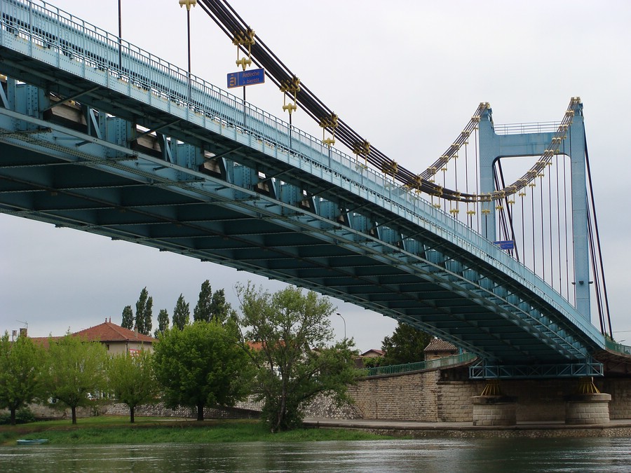 Die blaue Hängebrücke überspannt den nicht kanalisierten Arm der Rhône zwischen Serrièrres (Dept. Ardèche) und Sablons (Dept. Isère). |