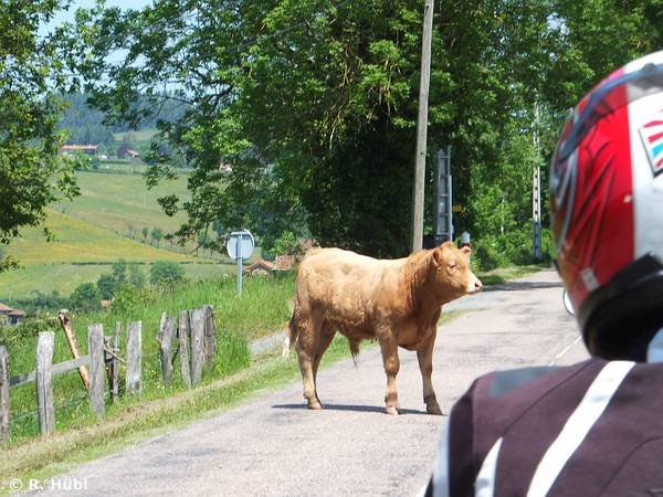 Ein mehr tierisches denn geistliches Vergnügen - naja, nicht wirklich - gab es im weiteren Streckenverlauf, als uns hinter einer Rechtskurve plötzlich ein Jungbulle, frei auf der Straße stehend, blöd anglotzte. Der musste von der Weide ausgebüchst sein, was dem mächtigen Oberbullen auf der anderen Seite des Zauns offensichtlich gar nicht gefiel. Mir auch nicht, denn weder der unberechenbare Jungbulle, der jederzeit auf uns losstürmen konnte (so meine Befürchtung), noch der drohend drein-blickende Altbulle direkt am Weidenzaun wirkten vertrauenerweckend. Und Michael ... stieg vom Motorrad ab, ging auf den Jungbullen zu und fotografierte ihn. Der hatte Nerven! Ich blieb lieber startbereit auf meiner Hornisse sitzen, innerlich ein wenig auf glühenden Kohlen sitzend. "Können wir so langsam mal weiterfahren?" Ich traute dem Frieden nicht so recht.