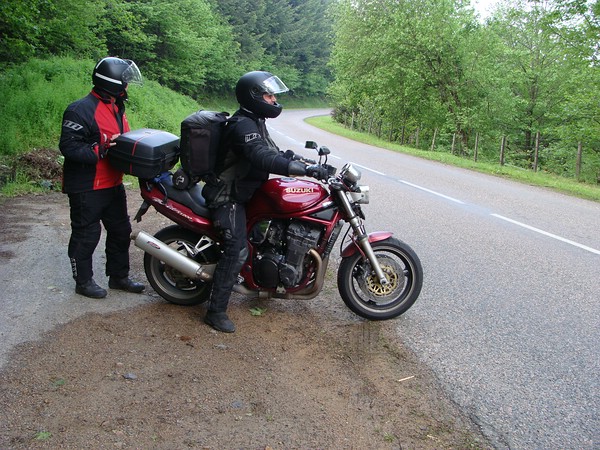 Es war eine sanfte Landschaft, die wir auf kleinen Straßen durchquerten. Ich gestehe, ich hatte zwischenzeitlich die Orientierung verloren und selbst als ich bei einer Trinkpause am Straßenrand den Blick auf die Karte warf, half mir das nicht wesentlich weiter, denn die Straßen, die wir befuhren, waren von kleiner Größenordnung. Immer schön hinter Michael herfahren, er würde schon wissen wohin, grobe Richtung Nordost. Zunächst aber durfte er noch ein letztes Mal erfolgreich seinen Dienst als Rainers Anschieber leisten. Nur ... Rainer grinste etwas (zu) verdächtig und Michael fragte misstrauisch "Das war jetzt ein Fake, oder?" Rainers Grinsen wurde breiter. Immerhin: endlich hatte ich einmal bei dieser Aktion den Fotoapparat zur Hand! Michaels Drohung, die Bandit zukünftig nicht mehr anzuschieben, wirkte dann auch für den restlichen Urlaub.
