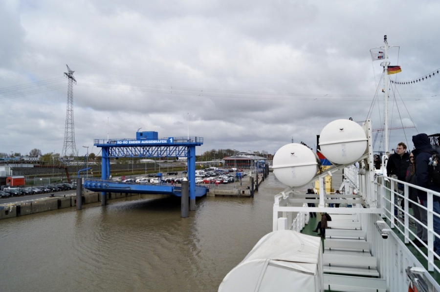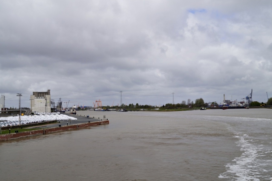 Ausfahrt aus dem Hafen von Emden. Bis zur Emsmündung und somit offenen See dauert's aber noch. |