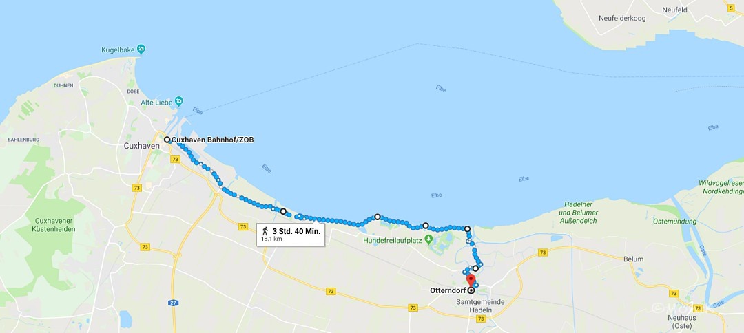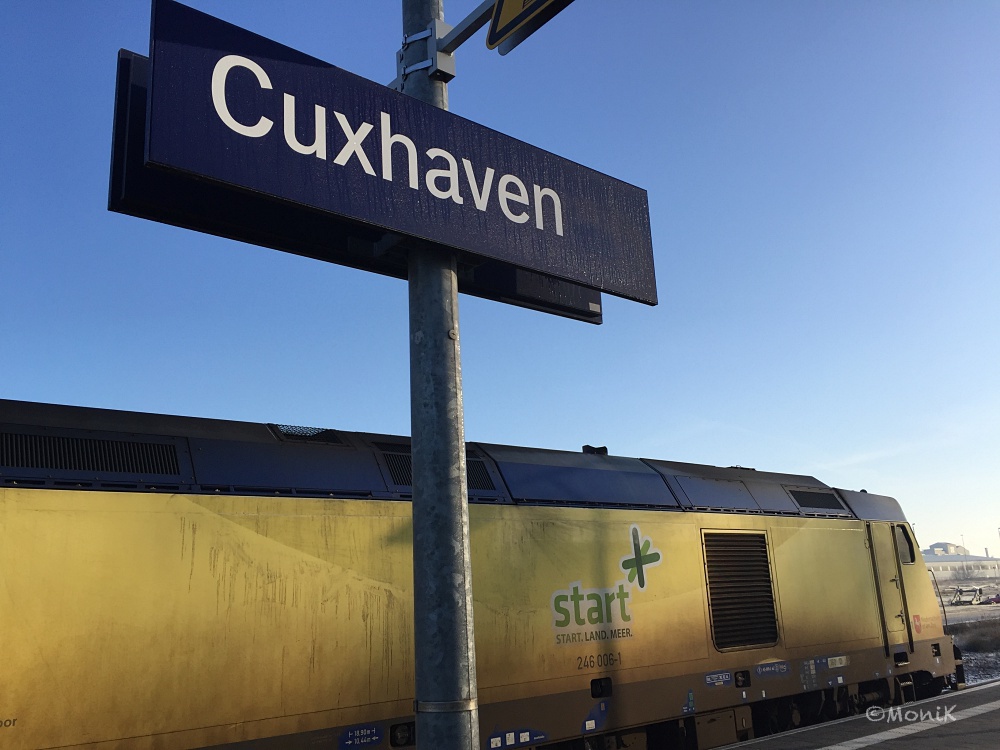 Also auf in die Wanderstiefel, auf zum Bahnhof, auf nach Cuxhaven, von wo aus ich zu einer ca. 18km per-pedes-Tour elbaufwärts bis ins Nordseebad Otterndorf aufbrechen möchte. Die Wettervorhersage kündigt zwar einen kalten, dafür sehr sonnigen Tag an.