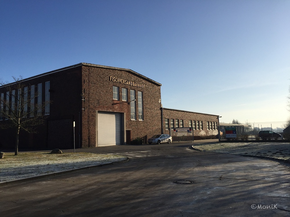 Zunächst jedoch genieße ich die warme Luft im Zug nach Cuxhaven, und lege unterwegs eine stumme Musikeinlage à la „Knocking on Heaven’s door“ hin, als der Zug im so genannten Christkinddorf Himmelpforten hält. Wenig später ist Cuxhaven erreicht. Vom Stadtzentrum sehe ich wenig, der Weg in Richtung Unterelbe führt zunächst mehrere Kilometer durch den Fischereihafen. Dass der so groß ist, hätte ich nicht gedacht. Halt, ich muss präzisieren: ich durchquere den Neuen Fischereihafen (Fertigstellung 1939). Hier geht es deutlich weniger touristisch und lebhaft zu als im Alten Fischereihafen, wo zwar auch heute noch Kutter ihren Fang löschen, die Atmosphäre dort zwischen den historischen Gebäuden aber stärker von Buden und Touristen geprägt ist. Vorbei geht’s am ehemaligen Fischversandbahnhof, 1933-35 als Erweiterung des ersten Fischversandbahnhofs erbaut und heute unter Denkmalschutz stehend. In Spitzenzeiten wurden hier täglich über 100 Eisenbahnwaggons mit Fischprodukten beladen. Auch heute zählt Cuxhaven noch zu den größten deutschen Fischereistandorten.