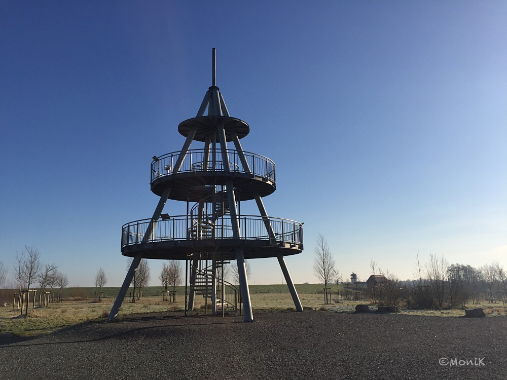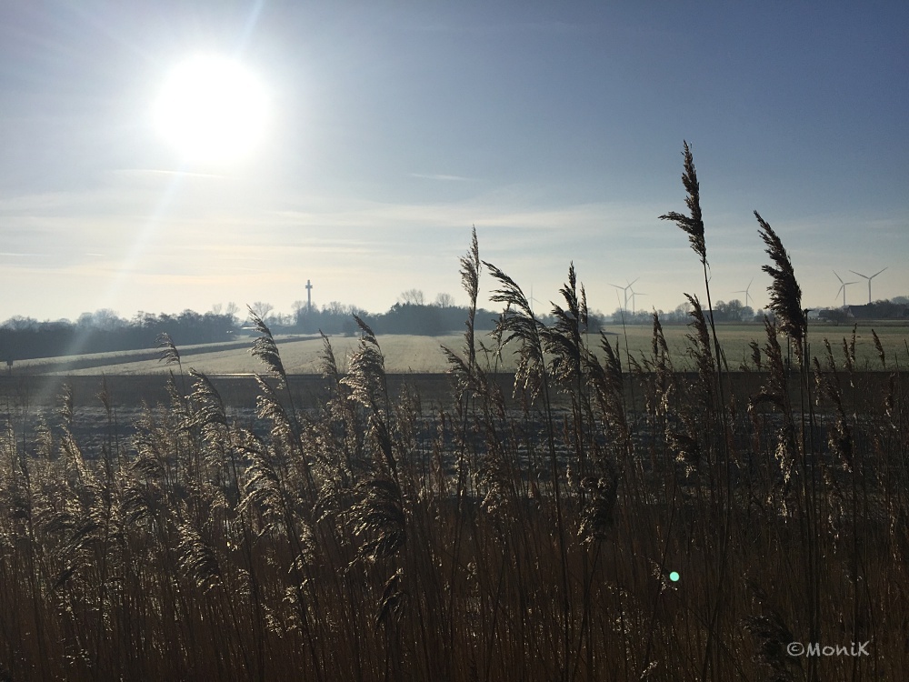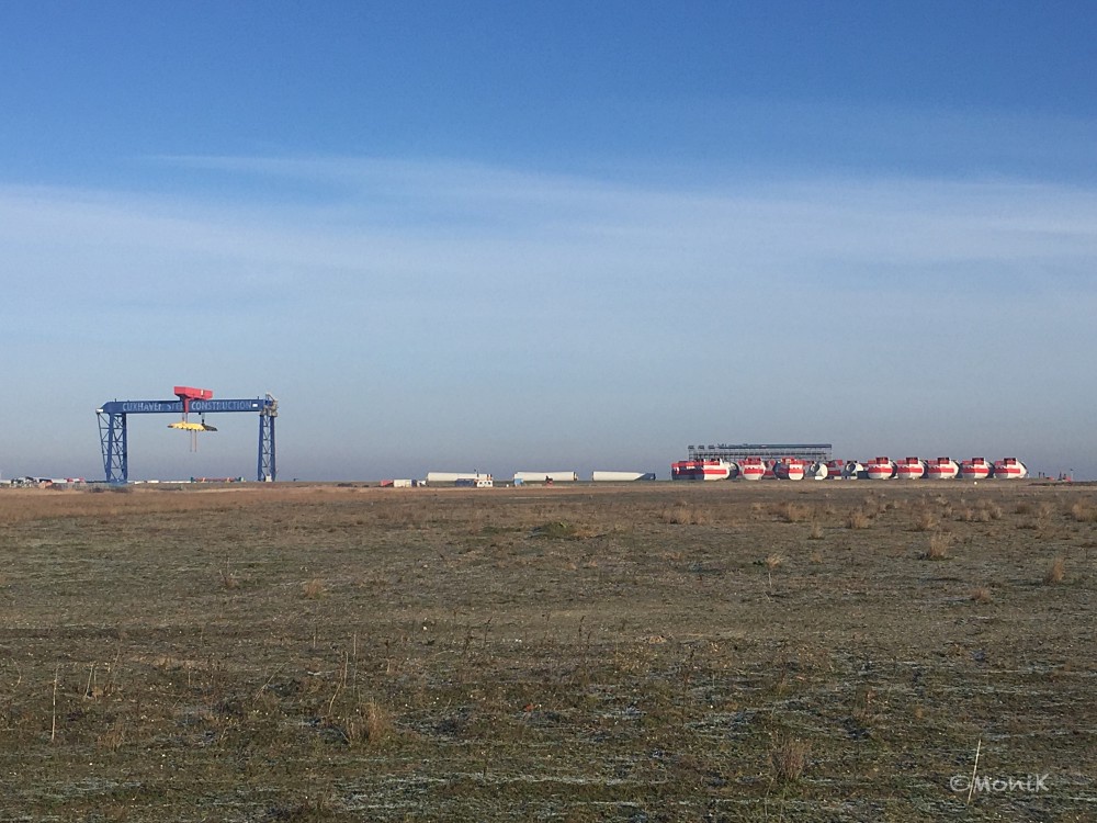 Nach ca. 5km ist die Stadtgrenze erreicht, und ich kann endlich auf die Waterkant zusteuern. Aus der Ferne sind die Anlage und einzelne Produktionselemente der ehemaligen Cuxhaven Steel Construction zu erkennen, welche hier bis 2013 Fundamentteile und Komponenten für Offshore-Windkraftanlagen gefertigt hat. Den Weg, den sich Fußgänger und Radfahrer teilen, führt auf den Landschaftspark Altenbruch zu. Angesichts der Temperaturen und den teils vereisten Wegen hält sich das Personenaufkommen doch sehr in Grenzen. Hier und da ein Hundebesitzer mit seinem Vierbeiner, und ein, zwei Radfahrer - das sieht im Sommer sicherlich anders aus. Umso mehr kann ich die Idylle am Landschaftspark Altenbruch genießen, einer künstlich geschaffenen, ca. 4 Hektar großen Wasserlandschaft, die um 2010 als Ersatz für das aufgespülte Offshore-Gelände nebenan angelegt wurde.
