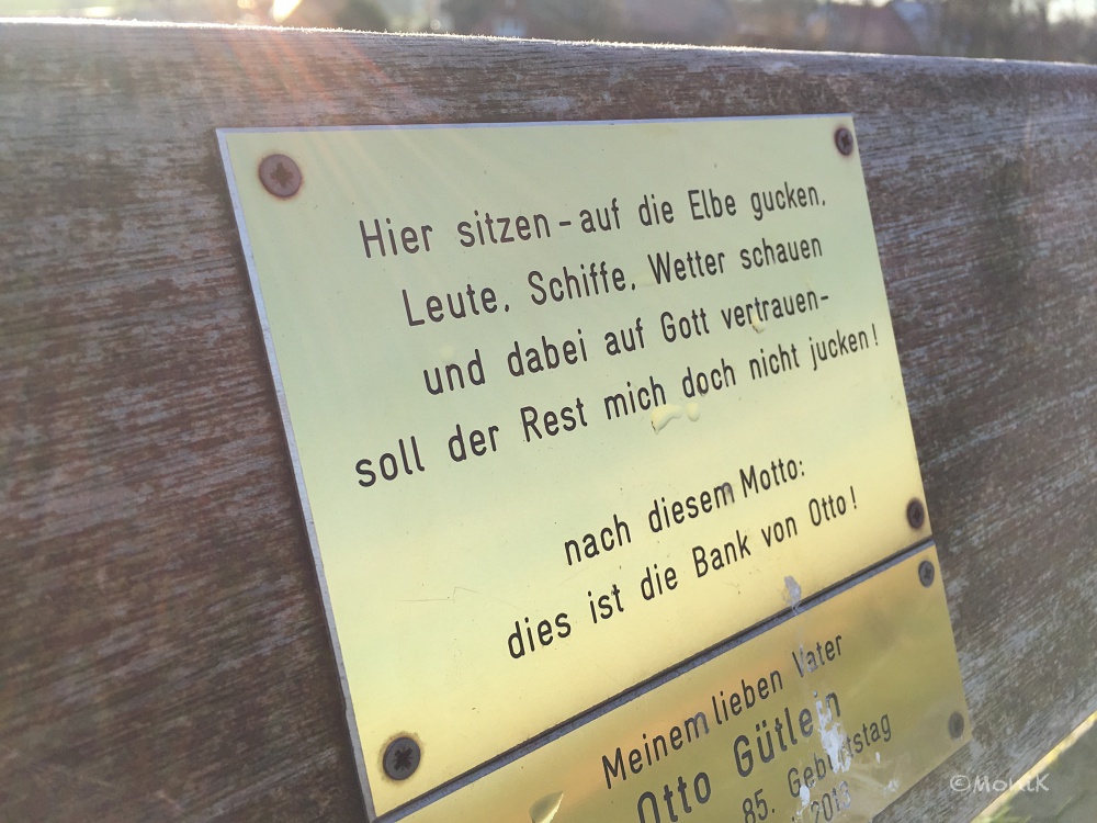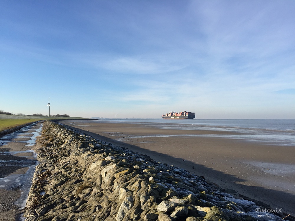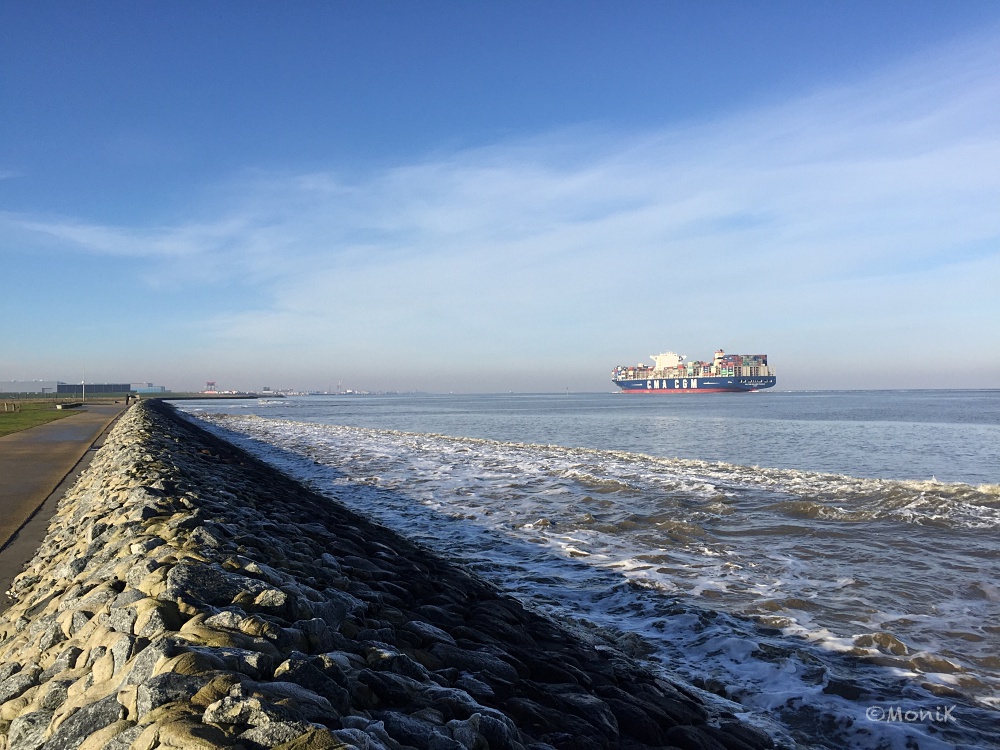 Eine eindeutige Attraktion: der kegelförmige Aussichtsturm. Von hier oben aus hat man einen herrlichen Rundblick auf den Landschaftspark, den Altenbrucher Hafen, die Dicke Berta (ehemaliger Leuchtturm und heutiges Standesamt), die angesiedelte Offshore-Industrie und - vor allem und natürlich - die Elbe. Die auf einer Infotafel aufgeführten Schweinswale sehe ich allerdings nicht … Und auch sonst sehe ich reichlich wenig Lebewesen, von Möwen, Austernfischern und Wattläufern abgesehen. Wahlweise über den Elberadweg oder über die Deichkrone führt der Weg vorbei am Altenbrucher Strandbad und entlang am Altenbrucher Bogen in Richtung Otterndorf. Das andere Elbufer in Schleswig-Holstein ist mit bloßem Auge kaum auszumachen. Ca. 15km ist die Elbe hier, kurz vor der Mündung in die Nordsee, breit. Die Containerschiffe, die von Hamburg aus die Elbe herunterkommen, wirken dennoch keineswegs wie verloren. Gigantische Dimensionen für ein Zeugnis von Wirtschaft und Konsum. Die größten Containerschiffe heutzutage können über 20.000 20-Fuß-Container laden. Eine für mich schier unvorstellbare Menge. Dass hier nicht nur Container-, sondern auch Wassermassen bewegt werden, lässt sich nach dem Passieren des Schiffs beobachten, als das Wasser mit kräftigen Wellen an die Deichkante zurückschlägt.