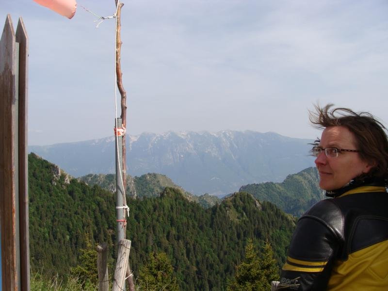 Schade, dass es wieder einmal so diesig ist und die nicht klare Luft den Blick auf das Monte Baldo Massiv etwas trübt. Von hier kann man aber schön die Spitzen des Massivs durchzählen, von denen einige über 2.000m hoch sind. |
