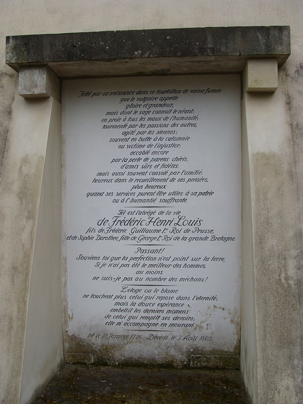 Inschrift am Grabmal von Prinz Heinrich im Garten von Schloss Rheinsberg. Da verließ sogar mich das französische Vokabular. |