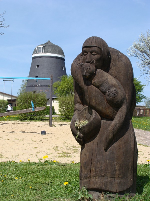Holzfigur im Mühlenmuseum in Woldegk. Im Hintergrund das Mühlencafé in der ältesten Mühle von Woldegk. |