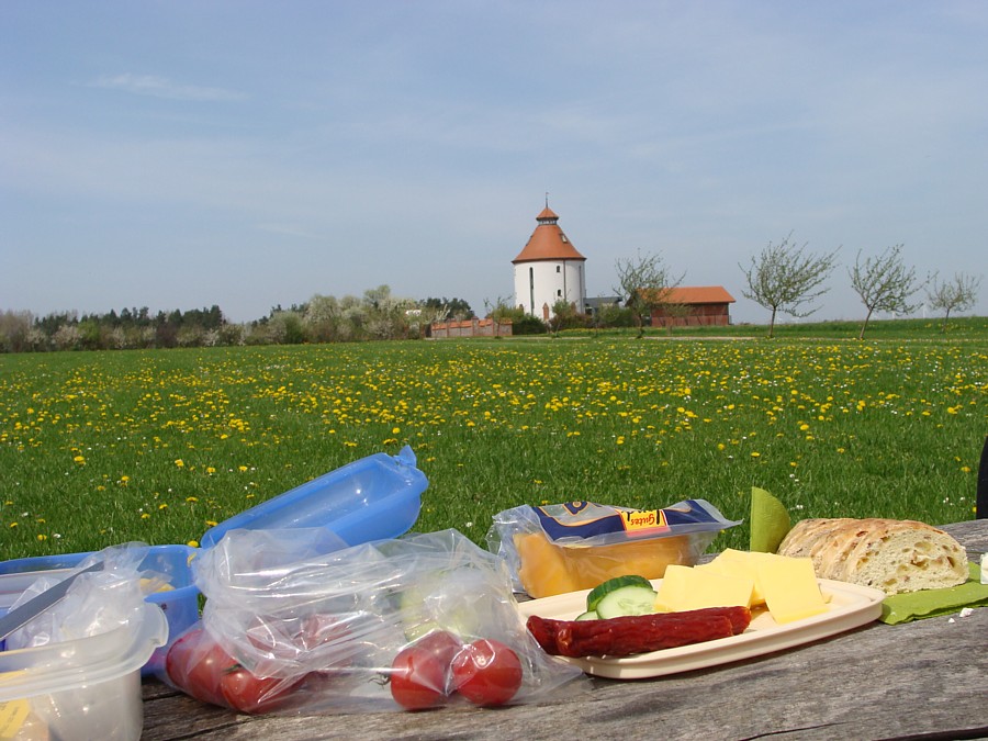 Leckerschmecker vor historischer Kulisse. Auf dem Mühlenberg bei Woldegk, im Hintergrund der alte Wasserturm. |