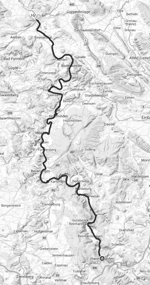 Zugegeben, in manchen Momenten bin ich richtig optimistisch. Manchmal aber auch einfach blauäugig, z.B. hinsichtlich der eigenen Kräfte und/ oder Fähigkeiten. So muss es auch um den Jahreswechsel herum um mich bestellt gewesen sein, als ich mit Iris und Kerstin zusammen-gesessen habe, um Jahresplanung zu betreiben. Zu diesem Zeitpunkt fehlte mir das Vorstellungsvermögen, was nach meinem folgenreichen UMfaller im Juni 2013 nun körperlich möglich sein würde. Dass ich vor Juni wieder Motorradfahren könnte, dachte ich da noch nicht. Wohl aber, dass doch Fahrradfahren sicherlich möglich sei und dies doch zudem ein prima Muskelaufbautraining für die arg in Mitleidenschaft gezogenen Oberschenkel sein würde. Und so stellte ich meinen Mädels die Frage, ob sie sich eine mehrtägige Fahrradtour vorstellen könnten, mit der Betonung auf "Spazierfahrt". Und ja, sie konnten! Alle Augen strahlten, das Zielgebiet war schnell gefunden: mal wieder Weserbergland. Wir kommen nicht davon los! Weshalb auch? Aller guten Dinge sind 3: Nachdem wir es schon so per Motorrad und zu Fuß unter die Lupe genommen hatten, war nun die Erkundung mit dem Drahtesel an der Reihe. Gesagt, getan. Entschieden, geplant. Das Wochenende über den 01. Mai wurde hierfür festgelegt. In vier Etappen sollte es insgesamt 140km von Hannoversch Münden, quasi der Geburtsstätte der Weser - sie hat keine eigene Quelle sondern entsteht hier aus dem Zusammenfluss von Werra und Fulda - nach Hameln gehen. Start- und Zielort wurden aufgrund der guten Erreichbarkeit mit der Deutschen Bahn ausgewählt. Doch die ersten Startschwierigkeiten folgten prompt, noch weit vor der eigentlichen Reise. Allein der Ticketkauf wirbelte die ersten Pläne schon durcheinander, da wir keine gemeinsame Fahrradreservierung für denselben Zug bekamen, was wiederum unterschiedliche Ankunftszeiten am Ausgangsort ergab. Für zusätzliche Spannung sorgte dann der Umstand, dass mein neu - und rechtzeitig! - erworbenes Fahrrad aufgrund einer Transportbeschädigung wieder zurückgeschickt werden musste, die Folgelieferung allerdings nicht ganz komplikationsfrei verlief und sich elendig hinauszögerte. Ich sah mich schon mit meinem angerosteten, schweren, mindestens 25 Jahre alten Mountainbike losziehen. Vor allem aber fehlte mir jegliche Fahrpraxis, so dass ich gar kein Gefühl dafür hatte, ob ich überhaupt 5km durchhalten würde. Meine Unsicherheit wuchs mit einem Vorfall in der Firma, als ich dort vor einer dauernd zuknallenden Türe in die Hocke ging, um diese mit einem Provisorium im Türspalt zu blockieren - ohne auch nur eine Sekunde lang darüber nachzudenken, dass ich diese Bewegung nicht ausführen könnte. Und schwupps ... konnte ich mich ab einer gewissen Höhe prompt nicht mehr halten und saß, bevor ich wusste wie mir geschah, verdutzt und frustriert zugleich auf dem Hosenboden. Na prima. Und ich wollte 140km Fahrradfahren??? Ich tröstete mich damit, dass mein Kopf immerhin offensichtlich schon weiter war als mein Körper, und diesen als für "geheilt" einstufte. Das beruhigte mich nicht wirklich, und so ging's mit reichlich Ungewissheit und gerade mal 10 absolvierten Testkilometern auf dem auf den letzten Drücker gelieferten neuen Fahrrad los.