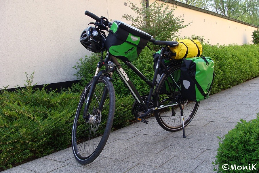 Morgenstund hat vielleicht Gold im Mund, aber sicher keine Kraft in meinen Beinen. Zu der für mich recht unchristlichen Zeit von 5h45 klingelt der Wecker, und um 7h15 schwinge ich mich auf meinen vollbepackten Drahtesel, dem ich aufgrund der farblichem Dominanz schnell den Namen "Grashüpfer" verleihe.