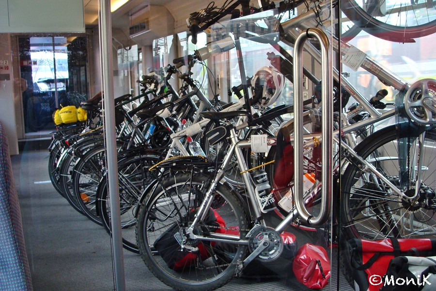 Auf dem IC-Abfahrtsbahnsteig endlich angekommen, sehe ich zahlreiche Radfahrer und Fahrräder, aber keine Kerstin. Mangels Erfahrung kommen leise Zweifel auf, ob denn im Zug wirklich Platz für uns alle ist!? Kerstin, Hilfe! Sie kommt wenig später mit dem Aufzug herabgeschwebt und auch alle weiteren Sorgen lösen sich in Luft auf, als der Zug einfährt.