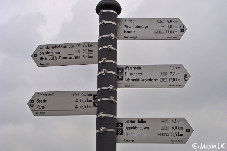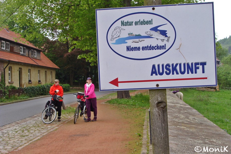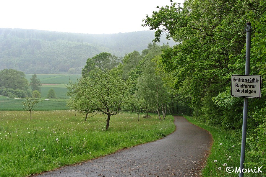 Dagegen dauert es etwas länger, bis wir Hannoversch Münden verlassen haben, da wir prompt erst einmal in die falsche Richtung radeln. War irgendwie nicht zu erkennen, dass wir uns plötzlich an der Werra anstelle der Weser befanden. Naja, im Grunde genommen waren uns die geplanten 25km am ersten (Halb-)Tag nur zu wenig ... *scherz* Aber diese Meinung revidiere ich bald, als auf den ersten Kilometern hinter Hannoversch Münden in relativ kurzem Abstand zwei kräftige Steigungen kommen, die mir sehr schnell meine Grenzen und die nicht vorhandene Muskelkraft aufzeigen. Das geht ja schon gut los! Und wenn das so weitergeht, wird das wohl nix mit den geplanten 140km. Wer sein Fahrrad liebt, der schiebt ... und ich habe meinen Grashüpfer lieb! Kerstin ihr Fahrrad ebenfalls, was mich ein wenig tröstet, während Iris bald nicht mehr zu sehen ist. Vermutlich wird sie die Strecke doppelt und dreifach und mit Kringeln um uns herum fahren, damit ihr nicht langweilig wird.
