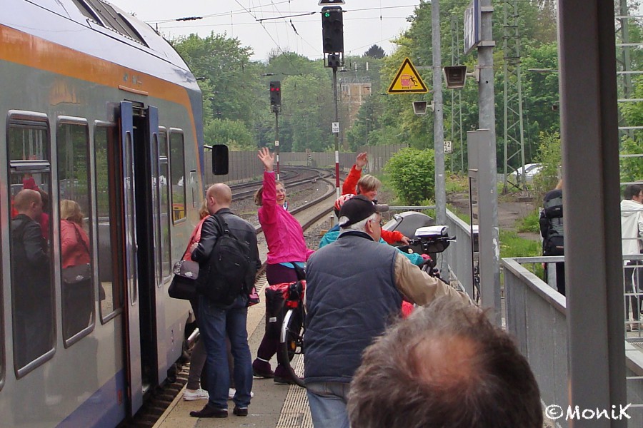 Hier kann ich auf die Hilfe (tat)kräftiger Männer bauen, die ebenfalls mit dem Rad den Weserradweg längs wollen, und mir beim Aussteigen und Ausladen behilflich sind. Frauenbonus und mein Glück, denn alleine hätte ich das kräftetechnisch wohl nicht geschafft. Auf dem Bahnsteig der Regionalbahn nach Hannoversch Münden tummeln sich noch mehr Radfahrer als in Hamburg und ich habe schon die Befürchtung, dass ich gar nicht in diesen Winzzug reinkomme. Doch die Ängste sind unbegründet - jeder hilft jedem und irgendwie gelangt jedes Fahrrad in den kleinen Zug. Gemütlich ist zwar anders, aber dabei sein in diesem Falle alles! In Hannoversch Münden angekommen habe ich dann erst einmal alle Zeit der Welt um auszusteigen, das Gepäck zu sortieren und die Gegend rund um den Bahnhof zu erkunden, bis gegen 13h00 dann auch Kerstin und Iris mit großem Gewinke und breitem Grinsen auf den Bahnsteig ausgespuckt werden.