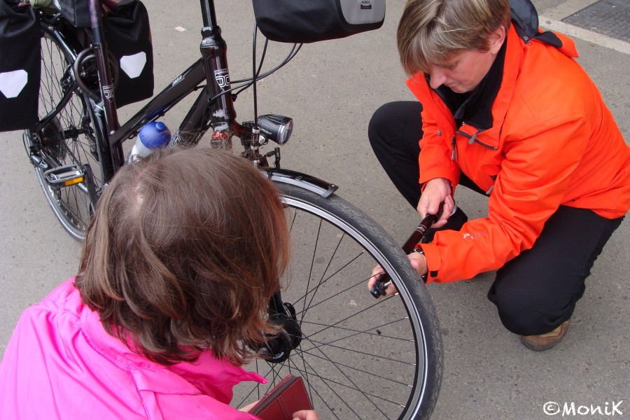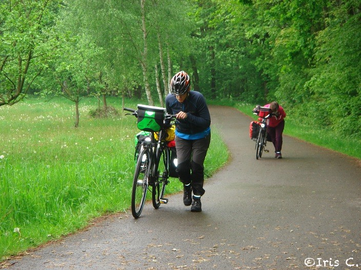 Jucheee, endlich vereint und wieder gemeinsam auf Tour! Wir stehen noch keine fünf Minuten zusammen und sind schon wieder laut am lachen, als Kerstin und Iris ihre amüsanten Aufzugerlebnisse aus Göttingen erzählen. Die Stimmung wird auch nicht durch einsetzenden Regen getrübt, der gottseidank nur von kurzer Dauer ist.