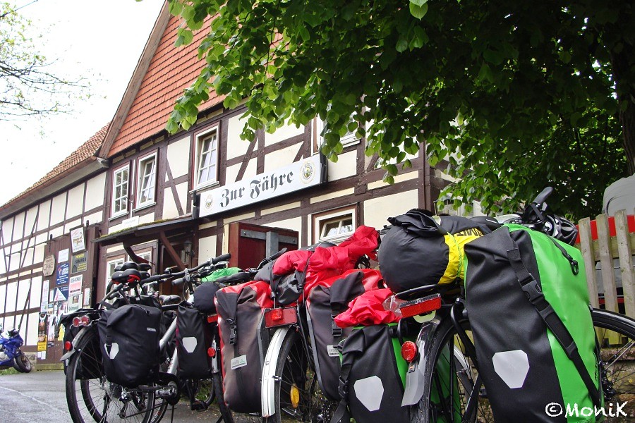 Unser erstes - nicht geplantes - Zwischenziel erreichen wir nach ca. 12km. In Hemeln legen wir eine Pause am Gasthof "Zur Fähre" ein, direkt - wie der Name schon sagt - an der Fähre Hemeln-Reinhardshagen gelegen. Trotz des relativ feuchten Wetters sind hier Himmel und Menschen zu Fuß, mit dem Fahrrad oder dem Motorrad unterwegs, ein kunterbuntes Publikum sitzt an den Tischen unter den großen Kastanienbäumen, die in dem Fall mehr Schutz vor Regentropfen als vor Sonnenstrahlen bieten. Wir strahlen auch. Zufrieden und zuversichtlich. Die ersten Kilometer liefen doch schon ganz gut, da werden die restlichen 130km es auch tun! Wir genießen die Pause mit Warm- und Kaltgetränken, und dank einer nicht "rechnungsfähigen" Bedienung zahlen wir dafür einen unschlagbar niedrigen Preis. Mit frischer Kraft treten wir nach einer entspannten Stunde wieder in die Pedale in Richtung Bursfelde. Zunächst führt der Radweg zwischen Wiesen und Obstbäumen entlang, bevor er in einem Rechtsknick steil den Berg hinauf führt.