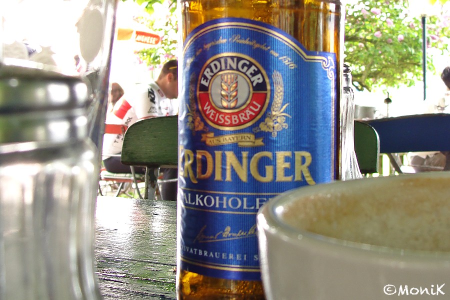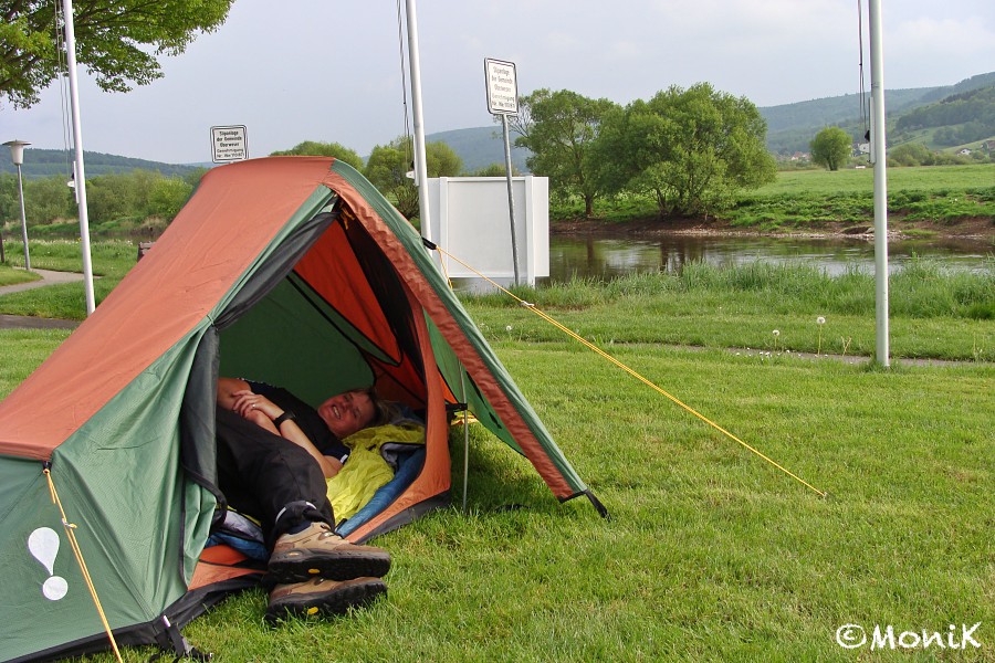 Dass Iris' Zelt für Außenstehende nun auch nicht wirklich groß wirkt, zeigt sich wenig später, als Passanten hinter ihrem Zelt vorbeigehen und sich laut die Frage stellen, ob da wohl ein Mensch komplett reinpasst. Iris, die nach dem Zeltaufbau in ihrem Zelt liegt, die beschuhten Füße aber zum Ausgang rausgestreckt hat, antwortet laut "Nein, die Füße müssen draußen bleiben!" Die Lacher sind mal wieder auf ihrer Seite, herrlich! Wenig später sitzen wir im Bistro und genießen unser erster "Zisch!" dieser Tour in Form eines schmackhaften Biers namens "Bergbräu Altstadt", einem herzhaft-würzigen dunklen Bier aus der kleinen Bergbräu-Brauerei im 8km entfernten Uslar. Lecker! Leider werden wir es auf keinem der weiteren Campingplätze wiederfinden. Wir stoßen glücklich grinsend auf den ersten Tourtag an und lassen ihn bei einem deftigen Abendessen Revue passieren.