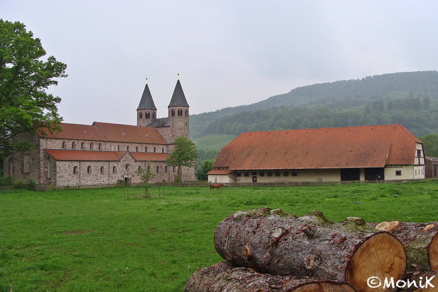 Trotzdem, das Gefühl von "geschafft" - im Sinne von: erreicht! - überwiegt die Atemnot. Zum Glück geht es gleich wieder leicht abwärts, doch von entspannt ist bei mir keine Rede, als aus asphaltierter Strecke plötzlich ein unbefestigter, leicht feuchter und dafür kurvenreicher Waldweg wird. Hui, hier geht die Post ab, was angesichts der schmalen Reifen und der eh noch in mir herrschenden Unsicherheit in punkto Fahrradfahren nicht nur Freudenschreie auslöst. Trotzdem: es ist ein wunderschöner Streckenabschnitt, den wir wenige Kilometer später an der Mauer des Klosters Bursfelde unterbrechen. Die Ende des 11. Jh. gegründete ehemalige Benediktinerabtei ist uns aus dem Vorjahr bereits bekannt, so dass wir heute keine Zeit für eine Innenbesichtigung nehmen. Meine Gedanken schweifen zurück an das schicksalsreiche Wochenende im Juni 2013 und an den langwierigen Weg, den ich seitdem zurückgelegt habe. Momente der Besinnung und auch der Dankbarkeit dafür, dass ich nun wieder hier stehe, wo ich gerade stehe.