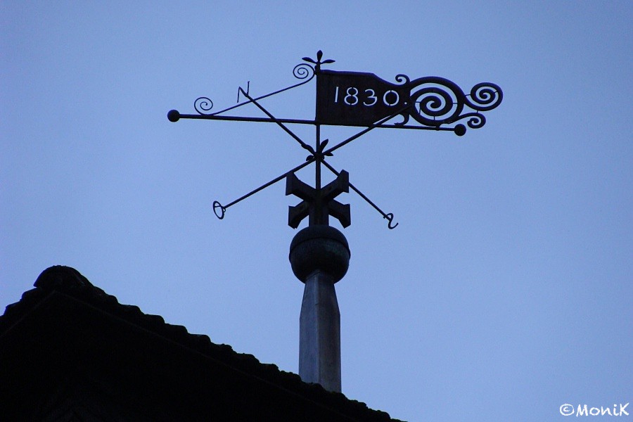 Daher weht der Wind. Wetterfahne auf dem Kirchturm von St. Martin, Oedelsheim. |