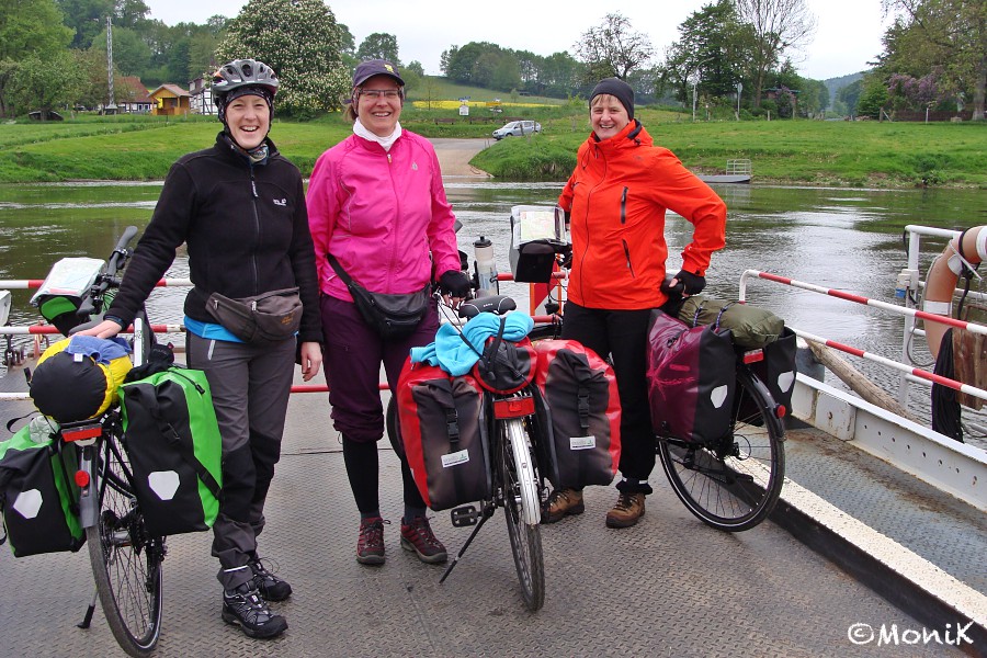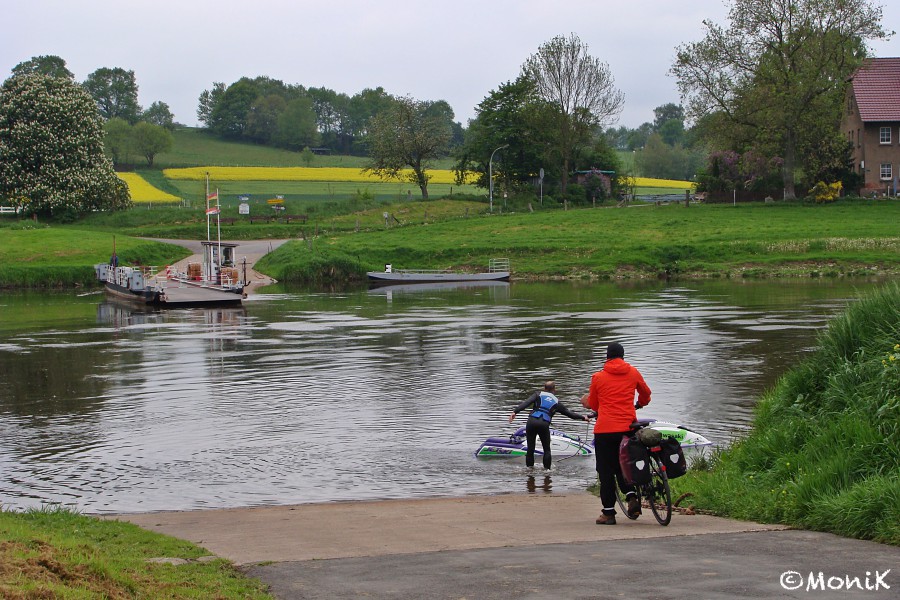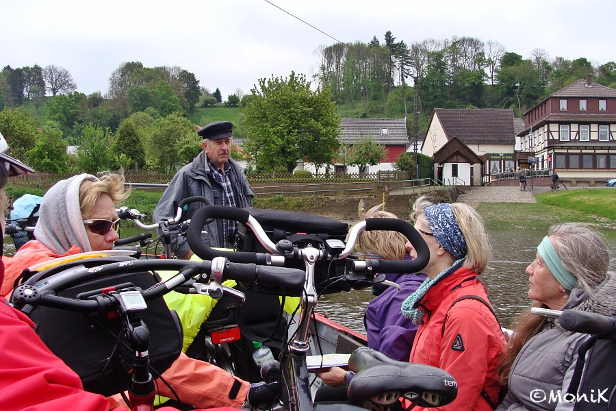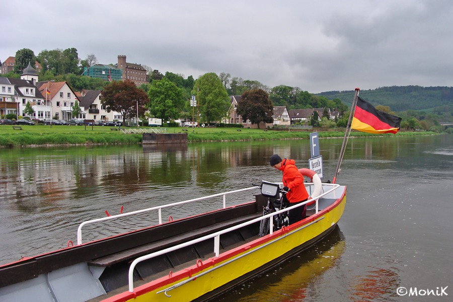In Würgassen legen wir eine kleine Denkpause ein. Wir müssen wieder auf die andere Weserseite. Nur: sollen wir hier mit der Fähre nach Herstelle übersetzen oder die in der Ferne sichtbare Brücke nehmen? Wir haben uns schon fast für die Brücke entschieden, als eine vorbei- kommende Tourenradfahrerin anhält und fragt, ob sie uns weiterhelfen kann. Sie empfiehlt uns dann eindrücklich die Fähre, denn der Radweg zur Brücke sei fies ansteigend. Fies??? Och nööö, dann lieber nett. Währenddessen wartet der Fährmann, der unser Zögern richtig interpretiert hat, geduldig auf uns. Seine Fähre ist eigentlich ein kleiner Kahn, und so ist es ein Akt, die Fahrräder dort reinzuhieven, aber ganz Gentlemanlike nimmt sich der Fährmann der Räder an. Wir sitzen schon auf dem umlaufenden Holzbrett („Bank“ trifft es nicht so wirklich) und wähnen uns bereits vom Ufer ablegend, als eine Gruppe von 6 Radfahrerinnen sich der Fähre nähert.