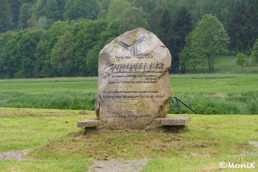 Um die „Gieselwerder Ecke“ und am "Galgengrund" vorbei geht es bis nach Lippoldsberg, wo wir mit der Fähre ans linke Weserufer übersetzen möchten. Während wir auf die Fähre warten - natürlich ist sie gerade am anderen Ufer - und uns den Text des neben der Straße in einen Felsstein gemeißelten Lieds der„Urdeutschen Weser“ zu Gemüte führen, beobachten wir zwei Jetski-Fahrer, die hier in die Weser einsteigen. Brrrr, beim Anblick der beiden mit Neopren-Anzügen bekleideten Fahrer läuft’s mir angesichts der herrschenden frischen Temperaturen kalt den Rücken herunter. Gottseidank wartet der Fährmann nicht auf weitere Fahrzeuge, sondern setzt prompt zu uns über - und begrüßt uns nicht nur gutgelaunt, sondern gibt uns auch Tipps für den weiteren Streckenlauf (z.B. welche steilen Anstiege wir vermeiden können). Zum Abschluss macht er noch ein Foto von uns Dreien. Wenig später bestätigt sich sein Tipp, bzw. ich bin dankbar, dass wir nicht in der anderen Richtung unterwegs sind.