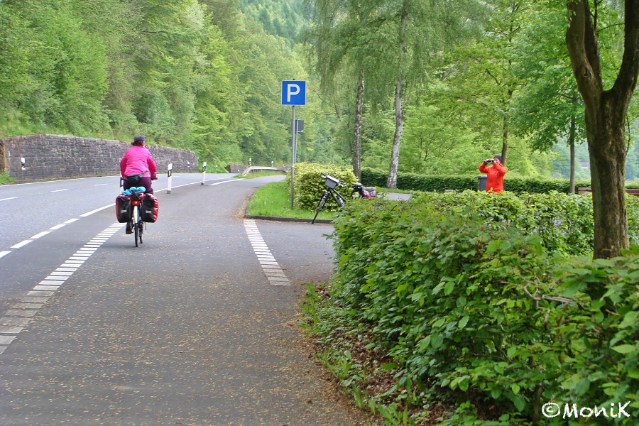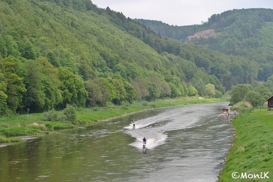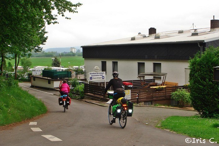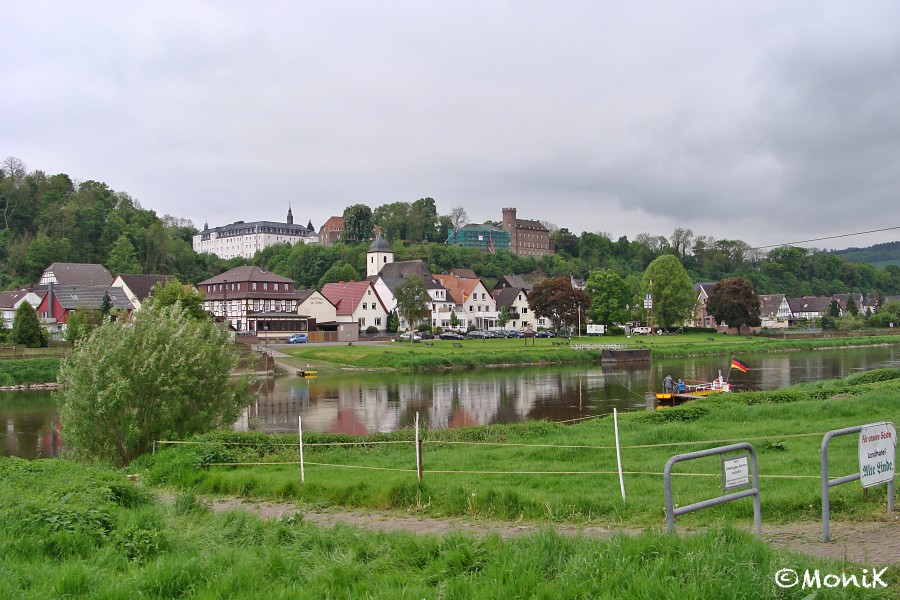 Überhaupt muss ich im weiteren Verlauf des Radwegs noch an den Fährmann zurückdenken. Nach Bad Karlshafen hin zieht sich die Strecke zäh und zunehmend steil den Berg hinauf. Wie war das mit den Streckentipps? Während Iris locker-flockig in die Pedale tritt und oben am Parkplatz Zeit genug hat, um sich mit dem Fotoapparat zu positionieren, sind Kerstins und meine Gesichtszüge angesichts der Anstrengung nicht unbedingt entspannt lächelnd. Puh, gottseidank ist die weitere Strecke nach Bad Karlshafen etwas abschüssig, und wir können die Zügel locker lassen. Bad Karlshafen, die nördlichste Gemeinde Hessens, ist auch als Soleheilbad und Barockstadt bekannt, doch wir halten uns hier nicht länger auf. Während wir die Weserbrücke queren, um wieder ans rechte Weserufer zu gelangen, hören wir auf dem Wasser lauten Motorenlärm - und siehe da: die beiden Jetski-Fahrer tauchen auf. Sollten wir etwa tatsächlich schneller gewesen sein? Kaum zu glauben. Aber uns ist sicherlich wärmer als denen.