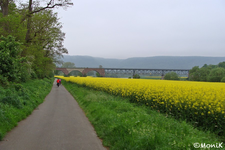 Die Fahrt am rechten Weserufer lässt uns auf den Hugenottenturm auf der anderen Weserseite blicken, während unser Radweg unterhalb der Hannoverschen Klippen - eine Gruppe von sieben bis zu 75m hohen Buntsandsteinsäulen, die wir aber leider aufgrund der dichten Bewaldung nicht sehen können - bis Würgassen verläuft.