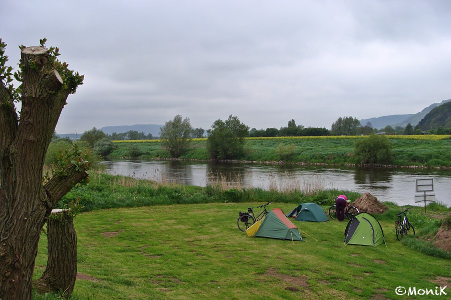 Dann geht’s über die Brücke ans rechte Weserufer, wo wir ein kurzes Stück stromaufwärts fahren müssen, um den Campingplatz zu erreichen. Uns ist kalt, und ich freue mich schon: auf der Homepage wirbt der Campingplatz mit kleinen Holzhütten für kleines Geld. Das wäre jetzt genau das Richtige. Nun, das haben sich andere wohl auch gedacht, denn auf unsere Nachfrage hin bekommen wir zu hören „Da hätten Sie früher an sein müssen.“ Natürlich alle Hütten ausgebucht. Man bietet uns eine größere Hütte mit mehr Komfort, aber auch zu einem höheren Preis an. Kostenbewusst wie wir sind, schlagen wir das Angebot aus und machen uns lustlos dran, unsere Zelte aufzubauen. Na gut, freuen wir uns halt auf den nächsten Programmpunkt: einmal in der Woche wird auf der Terrasse in einer großen Pfanne Fisch gebraten. Und just heute ist dieser Tag. Juchhee, wir freuen uns auf Pannfisch mit Bratkartoffeln. Doch die Freude hält sich in Grenzen, da - na klar - die wenigen Plätze drinnen in der Gaststube alle reserviert sind. Na prima, sonst verkrümeln sich die Camper doch auch in ihre Wohnwagen und Wohnmobile. Können sie das heute nicht auch tun?