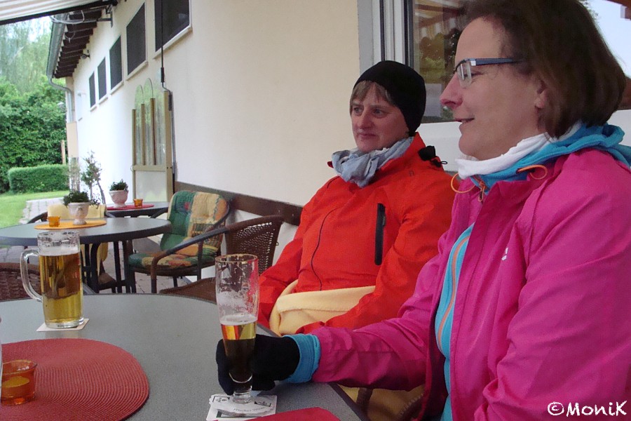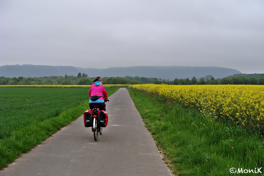 Immer schön locker-flockig bleiben! Das gelingt Iris an Ansteigungen deutlich besser als Kerstin und mir. Zwischen Wahmbeck und Bad Karlshafen. |