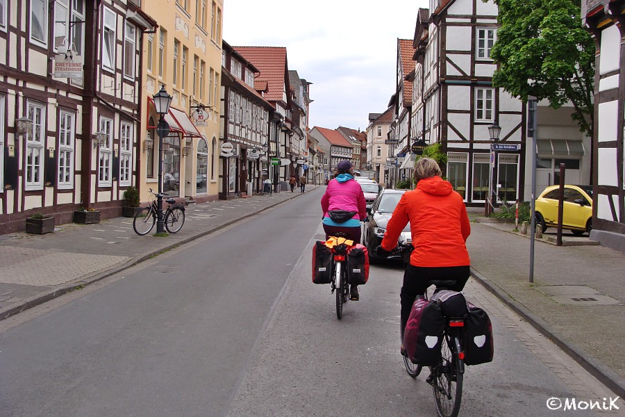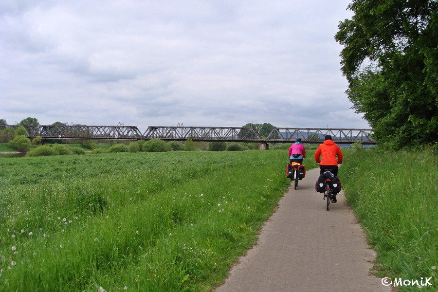 Bei bedecktem Himmel, kühlen Temperaturen und leichtem Gegenwind geht’s los. Bald haben wir die Münchhausenstadt Bodenwerder erreicht, doch da das Stadtzentrum auf der anderen Weserseite liegt, bleibt es von uns unbeachtet.