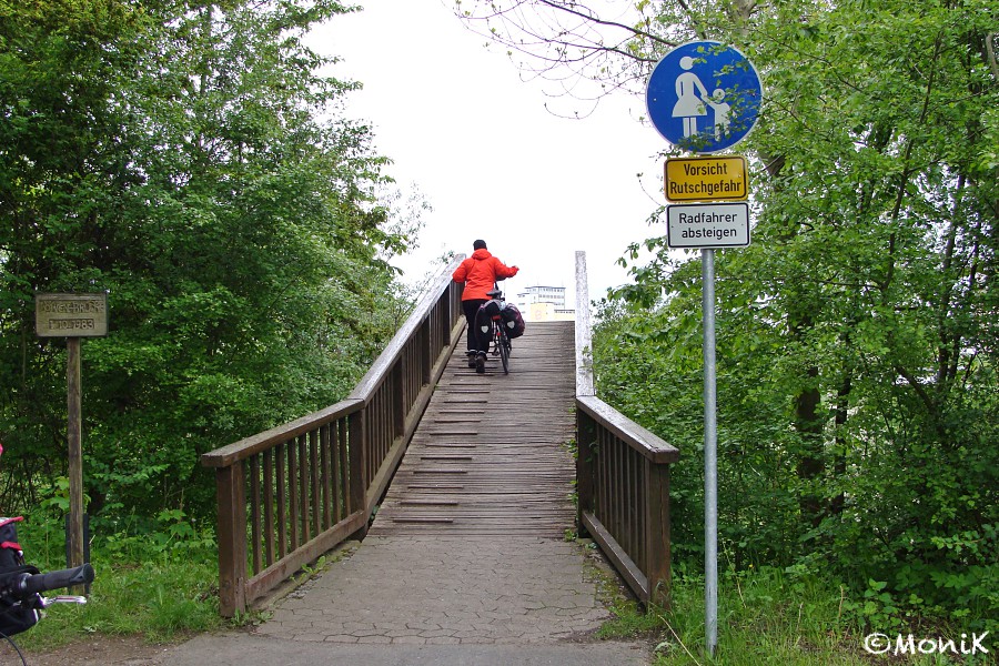 Aber nach minutenlangem Warten, in denen das Schaf munter durch die Gegend stapft, erkennen wir, dass wir wohl doch zu spät an sind. Es scheint die Nachgeburt zu sein, die da noch zu sehen ist. Aber auch das entdeckt man ja nicht alle Tage. Der weitere Streckenverlauf ist recht unspektakulär und überwiegend flach. Irgendwann erreichen wir die ersten Vorläufer der Stadt Hameln in Form eines Rudervereins, Kleingärten und eines nicht zu übersehenden Aurora-Silogebäudes. Und als ob es noch einen Höhepunkt auf dieser Etappe geben müsste, taucht plötzlich eine Fußgängerbrücke aus Holz mit richtig steilen Rampen vor uns auf, die es zu überwinden gilt. Huh! Hier wird mir doch bewusst, wie wenig Kraft ich noch in den Beinen habe - nicht das Hochgehen ist mein Problem, sondern das Runtergehen. Wie gut, dass es Fahrradbremsen gibt. Langsam nähern wir uns dem Zentrum der Rattenfängerstadt. Kurz vorm Hafen, an einem 1km-bis-zur-Stadtmitte-Schild ist ein Foto Pflicht für mich.