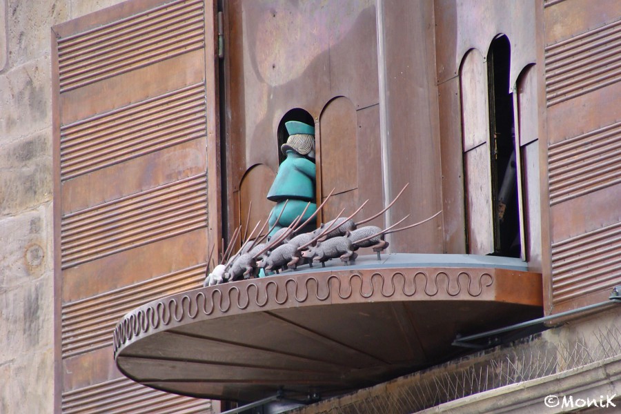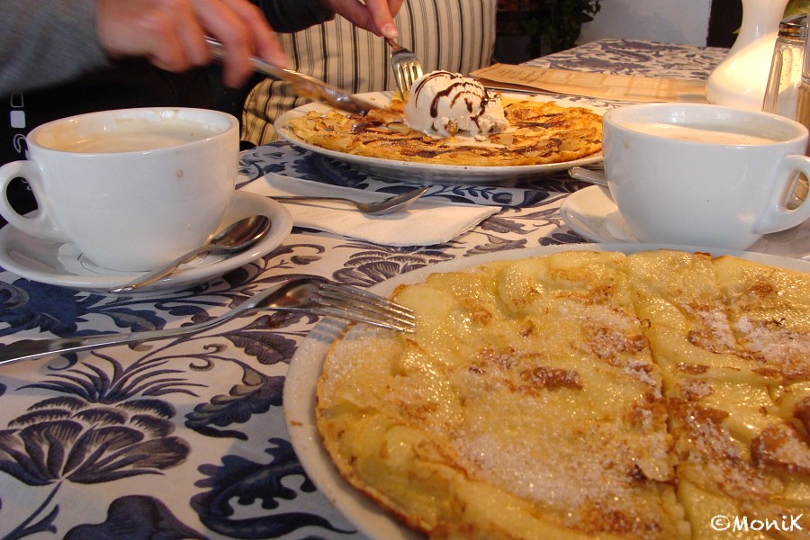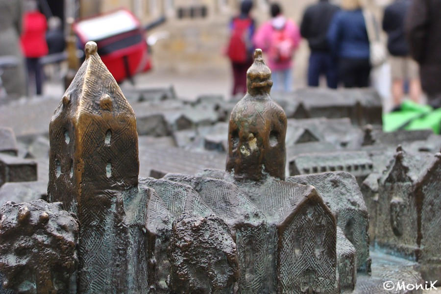 Währenddessen informiert uns ein einheimischer Radfahrer, dass heute in Hameln verkaufsoffener Sonntag ist. Wir sind gespannt - bei unserem letzten Hameln-Besuch vor einem Jahr herrschte absolut tote Hose.Nicht so heute. Während wir uns durch die Gassen den Weg ins Zentrum suchen, schlägt uns laute Bassmusik entgegen. Auf dem Marktplatz verstehen wir dann auch warum: eine Modenschau findet unter freiem Himmel statt. Die weiblichen Models laufen in luftigen Sommerkleidern bei arg frischen Temperaturen über die Bühne. Brrrrr, da helfen auch keine warmen Gedanken. Anhand eines dort aufgestellten Bronze-Modells der Stadt Hameln en miniature machen wir eine kleine Stadtbesichtigung, beobachten noch das Glockenspiel mit dem ausziehenden Rattenfänger von Hameln und suchen dann etwas Ruhe und vor allem eine Einkehrmöglichkeit. Die finden wir zufällig in einer kleinen Nebenstraße in einem der ältesten Häuser Hamelns. Hier ist das „Pfannekuchenhaus“, das mit einer ungezählten Anzahl von süßen und deftigen Pfannkuchen wirbt. Innen ist es unglaublich urig eingerichtet und dank eines befeuerten Kamins muckelig warm. Tut das gut! Und wie gut so ein Pfannkuchen erst schmeckt!
