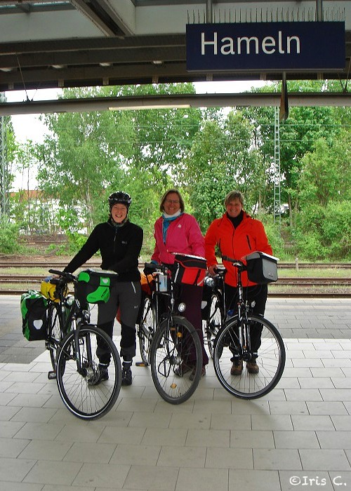 Am Bahnhof auf dem Bahnsteig angekommen wird ein sympathischer Mann von uns dazu verdonnert, ein Abschluss-Gruppenfoto unter’m „Hameln“-Schild zu machen. Beim Gedanken „Ziel erreicht“ kommen mir die Tränen. Es lässt sich so schwer in Worte fassen, welche Gedanken mir da gerade kunterbunt durch den Kopf gehen; sie lassen mich nicht unberührt. Sentimentalität ist aber kurz darauf nicht angebracht, als die S-Bahn nach Hannover einfährt. Menschenmassen sind unterwegs, und wir müssen uns erst einmal den Platz für die Fahrräder erkämpfen. Iris ist übrigens mit von der Partie, nachdem sie sich beim Bahnpersonal vergewissert hat, dass sie auch mit ihrem Ticket diesen Zug nehmen darf. Schön, so haben wir noch etwas Zeit und Ruhe, die letzten Tage Revue passieren zu lassen. In Hannover angekommen, werden wir mit den Massen aus der S-Bahn geschoben. Plötzlich ein Schrei von Iris „Wo ist meine Tasche?“
