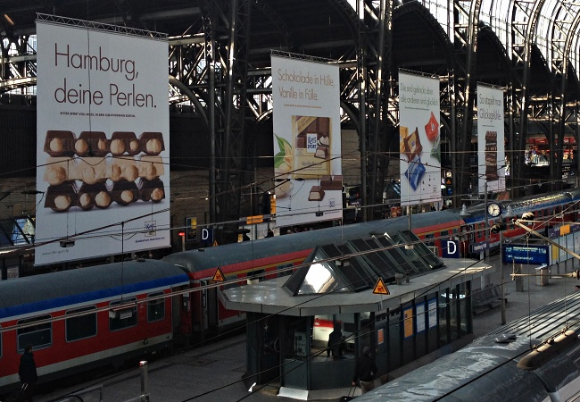 Nach der ersten halben Woche Vollzeit (8-Stunden-Tag) nehme ich Anfang März spontan eine kleine Auszeit. Einerseits, um die Akkus ein wenig aufzuladen und dem schnellen Alltag, dessen Tempo ich nach der langen Krankenphase noch nicht ganz mithalten kann, zu entfliehen; andererseits, um an einem anderen Ort zu testen, was mein Körper schon mitmacht und was nicht. Die Wettervorhersagen sind gut, die Bahnpreise günstig, und so sitze ich nach einem hektischen Morgen - Blumenladen, Arzttermin und Physiotherapie sind in knapper Zeitspanne unter einen Hut zu bringen - in der S-Bahn in Richtung Hauptbahnhof, von wo der InterCity nach Binz auf Rügen abfährt. Dort habe ich ein wenig Zeit und nehme schmunzelnd die Ritter-Sport-Werbungen zur Kenntnis. Da hat ein kreativer Kopf beste Arbeit geleistet! Und: ich liebe Hamburg! Wobei der Hbf allerdings definitiv nicht zu meinen Lieblingsorten zählt ...