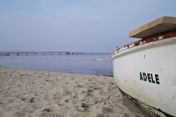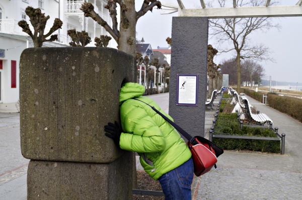 Nachdem ich noch Adele in ihrer ruhenden Pose abgelichtet habe, bin ich unschlüssig, ob ich mit dem Bus oder wieder mit dem Rasenden Roland zurück nach Binz fahren soll. Das Seebad Sellin mit seiner berühmten Seebrücke, die ich ursprünglich auf dem Rückweg noch vor die Linse nehmen wollte, habe ich gedanklich schon längst gestrichen. Der Weg vom Bahnhof zur Seebrücke ist mir heute einfach zu weit. Die Entscheidung Bus oder Bahn wird mir am Bahnhof von Göhren abgenommen. Hier treffe ich eine sehbehinderte Frau wieder, mit der ich bereits am Kleinbahnhof Binz ins Gespräch gekommen war. Mit meiner giftgrünen Jacke bin ich ihr jetzt wohl wieder aufgefallen, sie kommt auf mich zu.